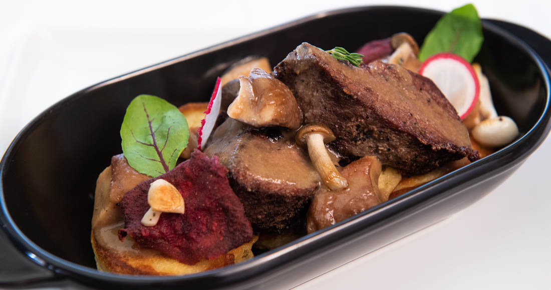 Ungvári marha stefánia, hajdinás blinin, vargányával ropogós céklával.
